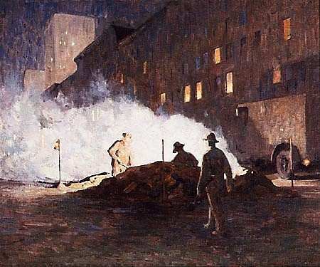Born in New York City in 1901, painter Dines Carlsen made a name for himself as a still life and landscape painter. Here he made nighttime New York City his landscape, focusing on the men called out to do the rough work of fixing steam pipes while most of the city sleeps.