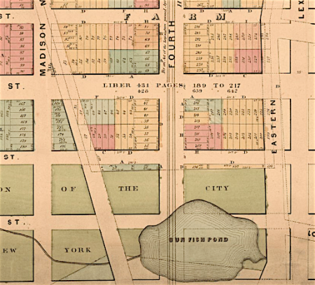 Sunfish Pond, lower right, on an 1867 map of the Ogden FarmSunfish Pond was “bounded by 31st and 33rd Streets and Madison and Lexington Avenues, fed by a stream rising between Sixth and Seventh Avenues at 44th Street, and flowing into the East River between 33rd and 34th Streets,” wrote Charles Haynes Haswell in his 1896 book, Reminiscences of an Octogenarian.