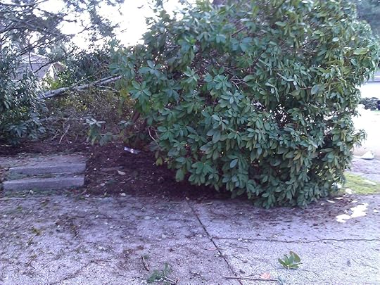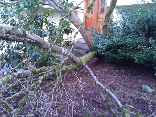 The big front rhododendron became a leaning tower of shrub. I talked about this in the last blog, but here you can see just how far forward it pulled out of the ground. Our vine maple didn’t fare much better. The front trunk snapped off at the base and the other trunks weren’t in good shape. One had a split and was using the roof as a crutch.