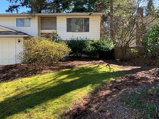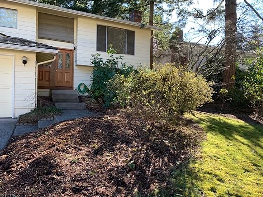 The tree removal people came by early and chopped through the tree like it was butter. With a five man crew, they were here maybe fifteen to twenty minutes! We were sad to see the tree and bush go, but replacements have been ordered and will be planted this week. The front yard looks so bare right now with them gone:
