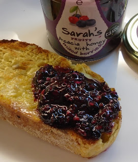 But I still prefer a creamy set honey spread on buttered toast. At least I thought I did until I tasted Sarah’s Acacia Honey with Mixed Berries.‘Taste this,’ I said to my husband, handing him a slice of toasted corn bread.