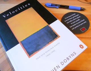 So I've just walked over to the shelf and taken out one poetry book that caught my eye: Velocities by American poet, Stephen Dobyns. I remember using a couple of his poems when I used to teach poetry at the University of Kent. I remember being moved to thought and feeling by them. So it's a good place to start.