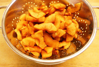 One thing leads to another... An online recipe for apple liqueur, back in October, asked for four pounds of apples to be soaked in sugar (halve the quantity of sugar if your apples are very sweet) and a bottle of brandy for two weeks. After straining and bottling the liquid - which doubles in quantity, by the way, so make sure you have two bottles handy - this is what remained: sweet, brandy softened apple slices that were far too delicious to throw away. So I froze them. Or, at least, I put them in the freezer, overlooking the scientific fact that alcohol doesn't freeze. But yesterday, two months later, despite having failed the total cryogenic test, they tasted fine to me so I let them sit overnight in the kitchen to relinquish their semi-frozen state, and created the following dessert. Although, given its simplicity, assembled would be a more accurate term.