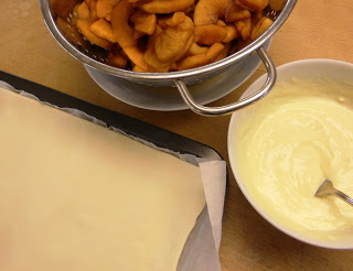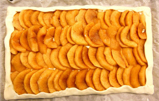 Unroll a sheet of ready-made puff pastry and spread with a mixture of cream cheese (8oz), icing sugar (2oz), cornflour (2 tbsp) and one egg yolk, leaving a border of at least 1 inch.Top that custardy layer with apple slices - tee-totalling slices would be fine, I'm sure, in the absence of drunken ones - and fold the edges of the pastry up and over. That's it.