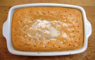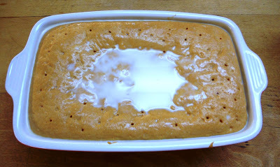 I am starting to doubt the recipe: do you pour the milk mixture into the cake hot from the oven? Do you leave the cake to cool? Is there enough flour to get a crumb texture? I am tipping through doubt towards failure.