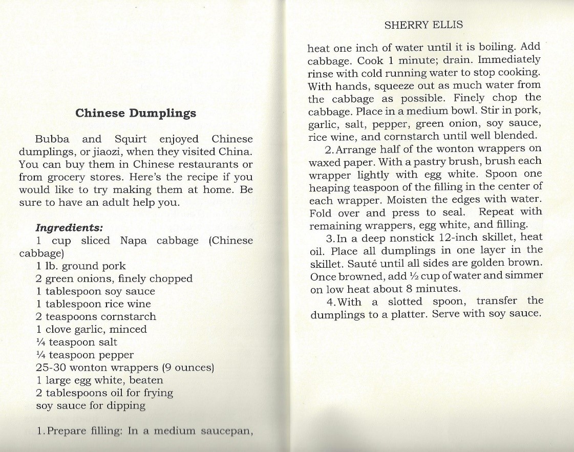 Ch’in Shi Huang-ti was a ruthless emperor, but he was an important figure in Chinese history. Some of his accomplishments included . . . . beginning construction of the Great Wall of China . standardizing Chinese units of measurements and currency . unifying Chinese scriptThroughout my story, Bubba and Squirt experience Chinese culture. They enjoy eating Chinese dumplings, or jiaozi. You can buy them in Chinese restaurants or from grocery stores. Here’s the recipe if you would like to try making them at home.