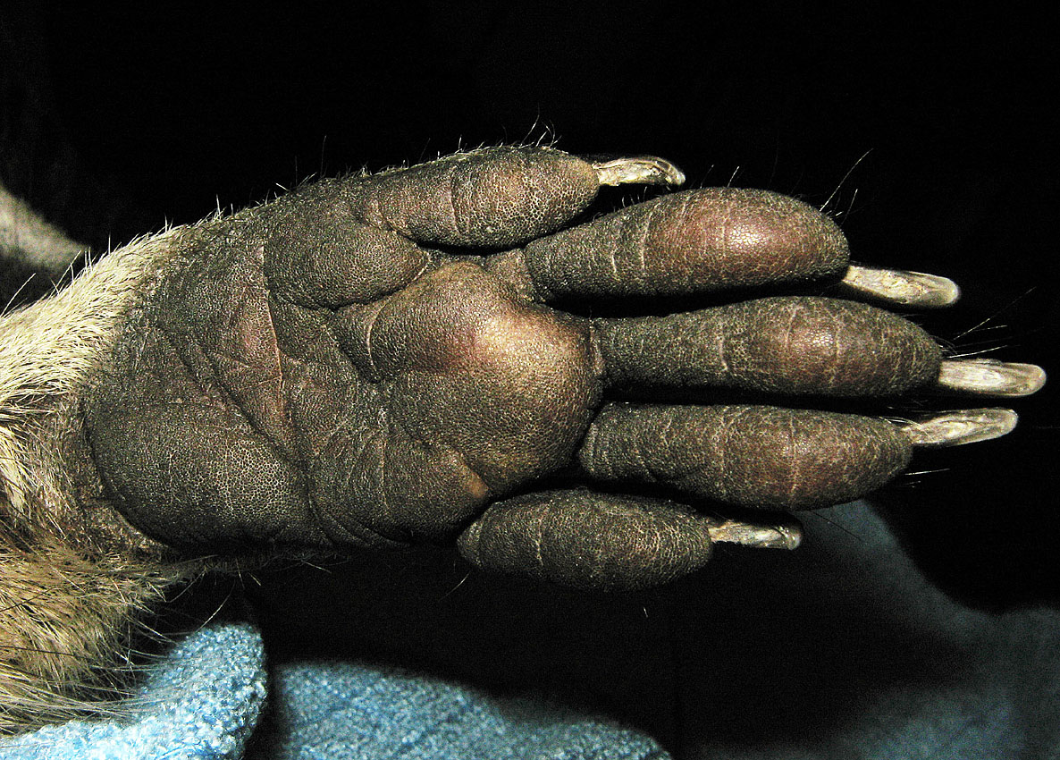 A underside of a racoon footLook closely. Are there nibbled plants? Broken bits of nut shell? An animal has eaten a meal! Are there feathers on the ground? A piece of fur stuck of a twig? Has a tree trunk been marked by a deer rubbing its antlers or maybe there are claw marks in the wood? An animal has passed this way.