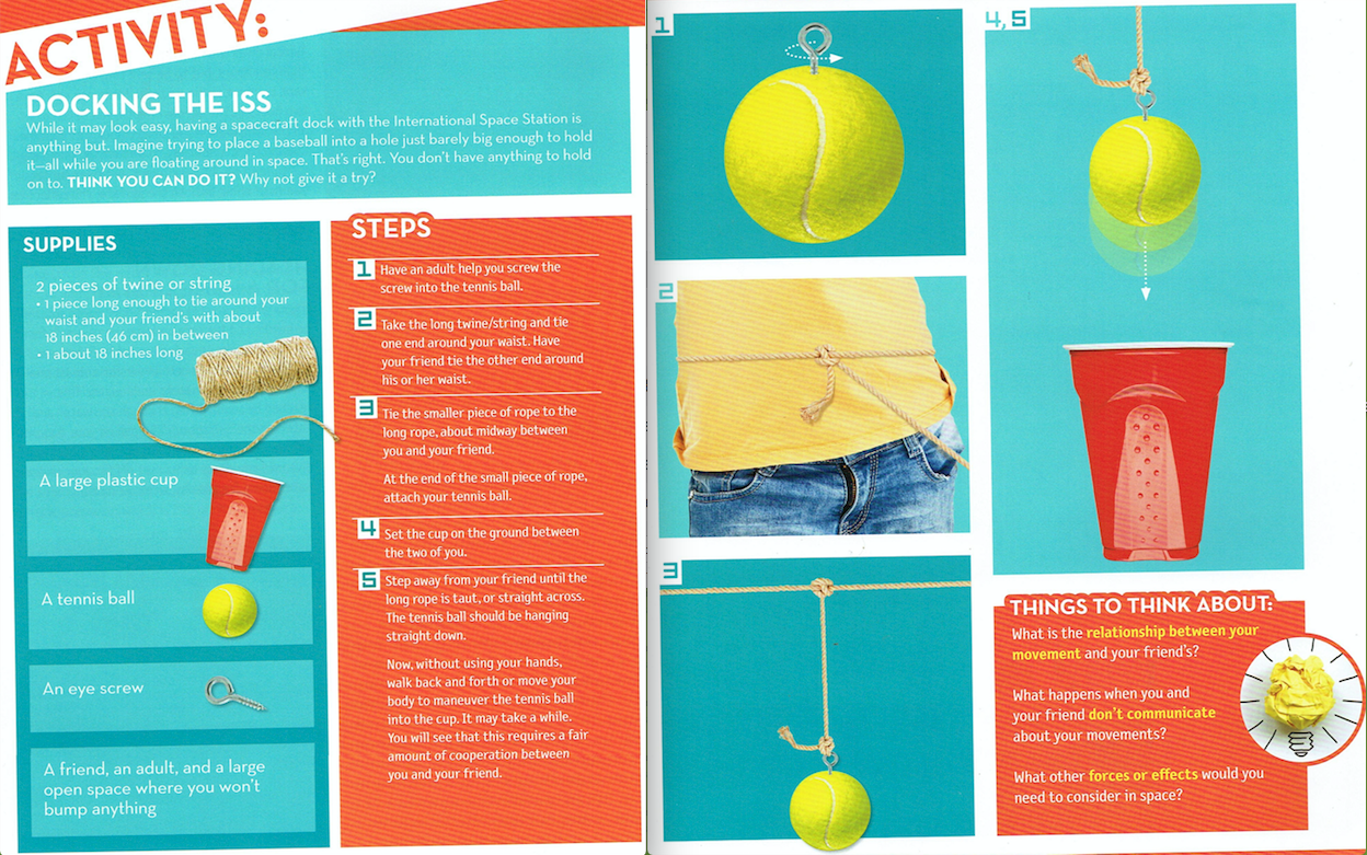 Astronaut Training:Do you have what it takes to dock at the Space Station? Grab a tennis ball, a big plastic cup, some rope or strong string and give it a try. It’s not as easy as you think!