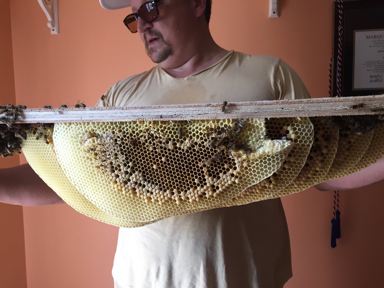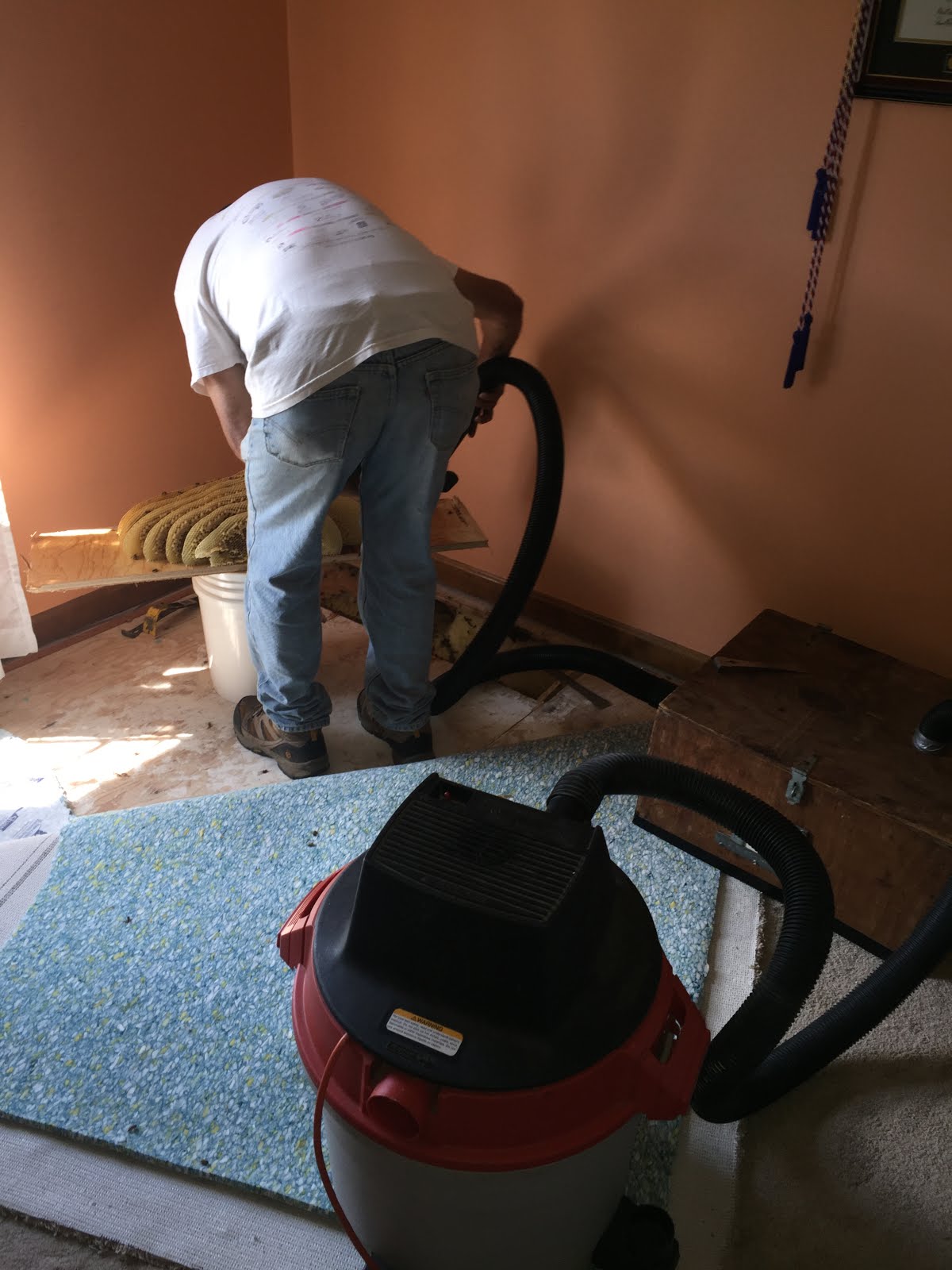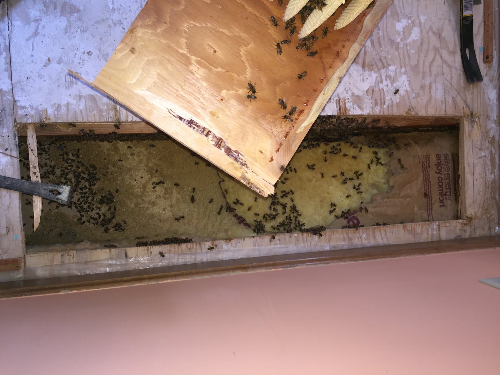 Last month I noticed what looked like bees floating in and out of a hole in my house. I called a friend who happens to be a bee expert. Sure enough, these were bees, and I hired him to take a look and see what was abuzz.These snaps and videos show what he found in the floor of my daughter's old bedroom--a hive about six weeks old. It took all day for two men to tear up the rug, listen for bees with a stethoscope, smoke the bees to make them sleepy, trim away the floor, and then remove the hive.
