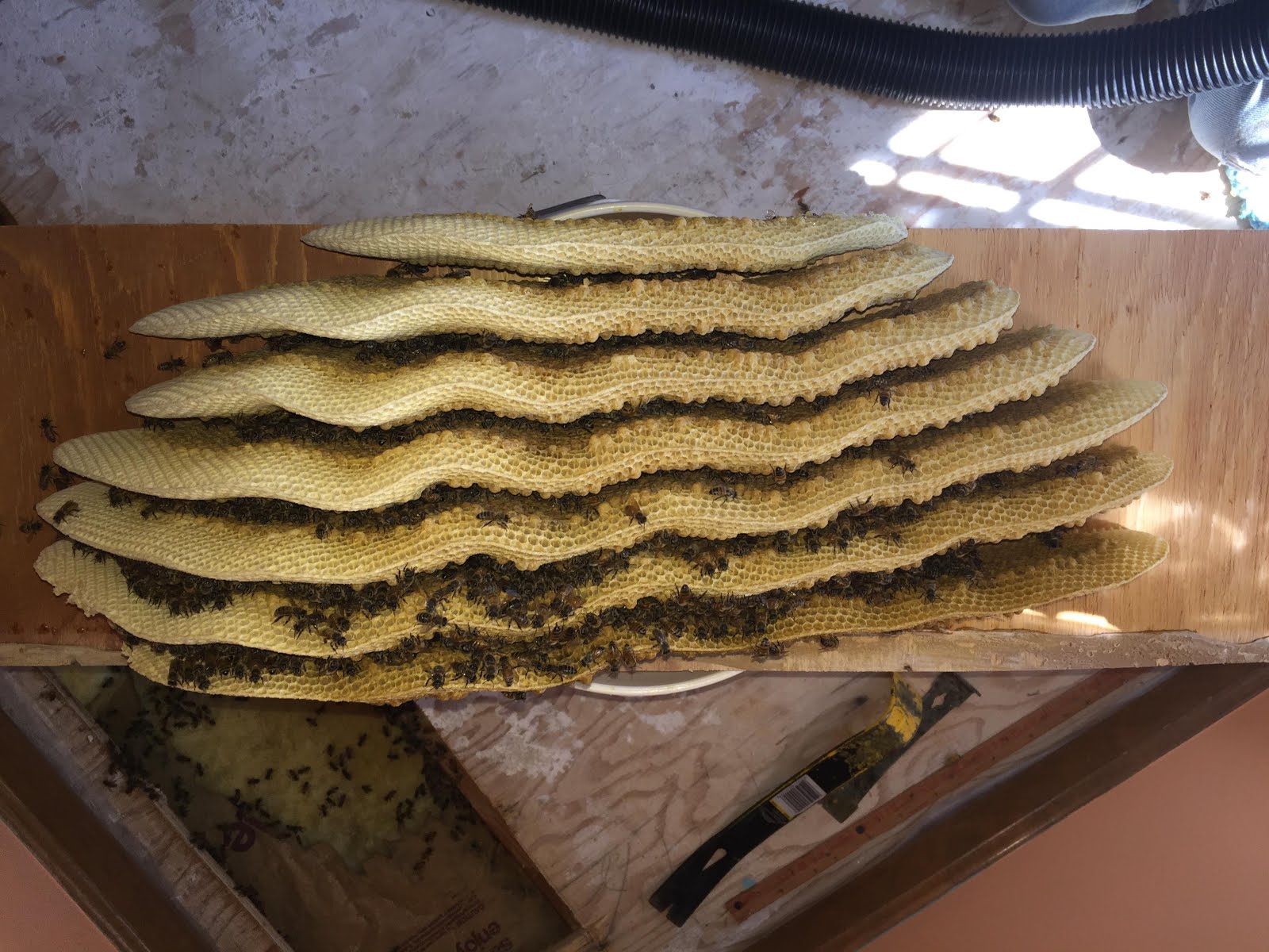 The hive was shaped exactly to fit a space under the floor. Birds had pulled away insulation and nested in their last year or so -- thanks to a hole made by a woodpecker sometime before that! Mother Nature at work in my house....