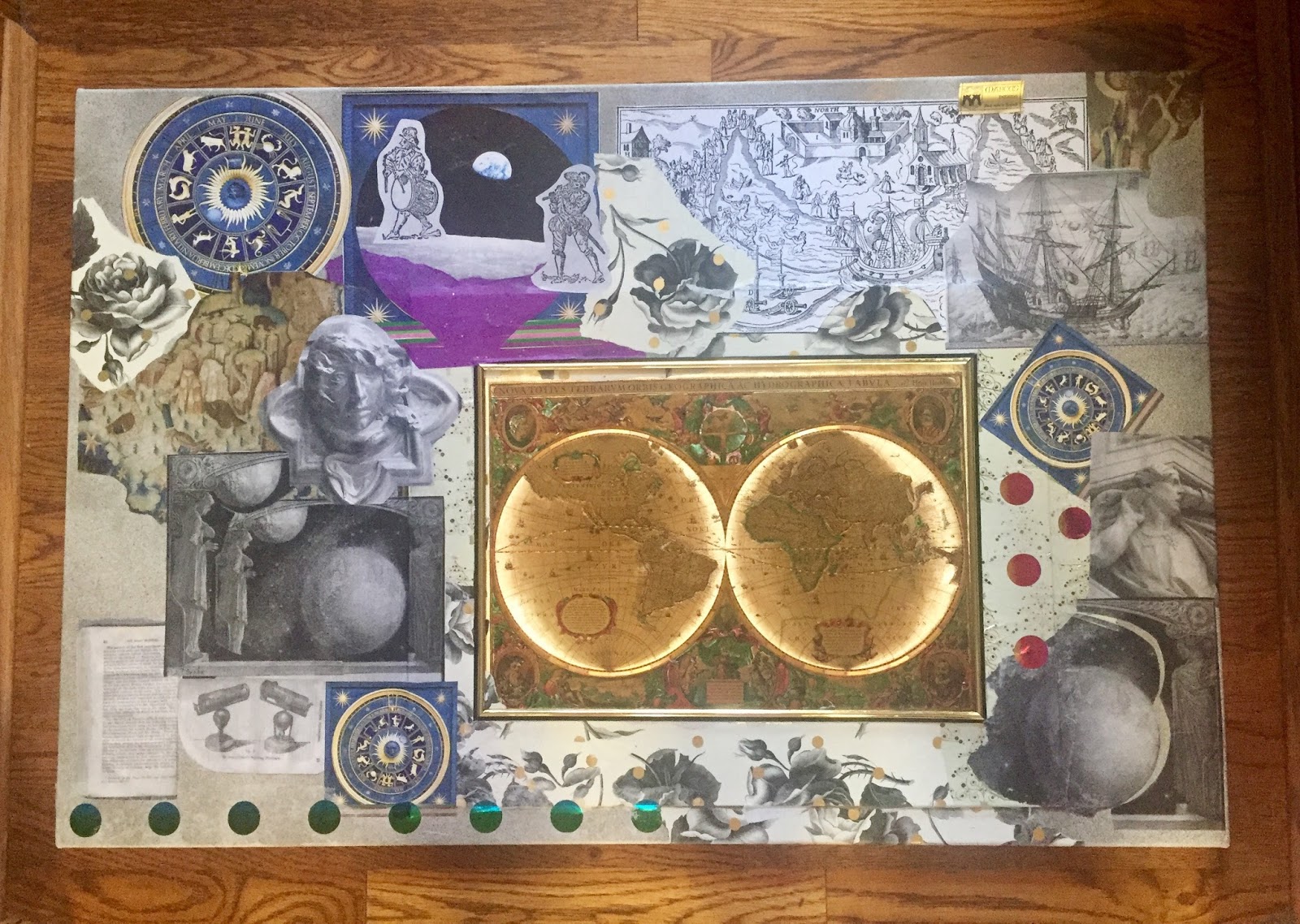 I’ve been playing with collage this week. Our kitchen island is a mashup of canvas, papers, found objects, Modpodge©, and Fedex© printouts which don’t run when wet. I started with a rummage sale treasure, a metal world map which I glued to a long piece of canvas sprayed lightly in gold and silver.