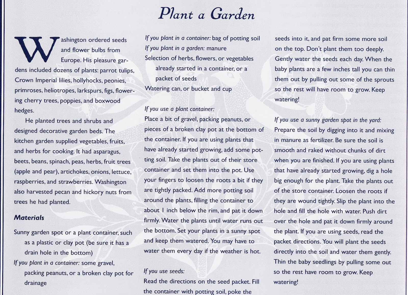 Kitchen garden at George Washington's home, Mount VernonAre you ready to get your hands dirty? We have several blogs about gardening-- check them all out! See my blog from February, 2014 to learn how to grow a plant from a cutting. Check out the activity below-- PLANT A GARDEN-- and try out your green thumb!