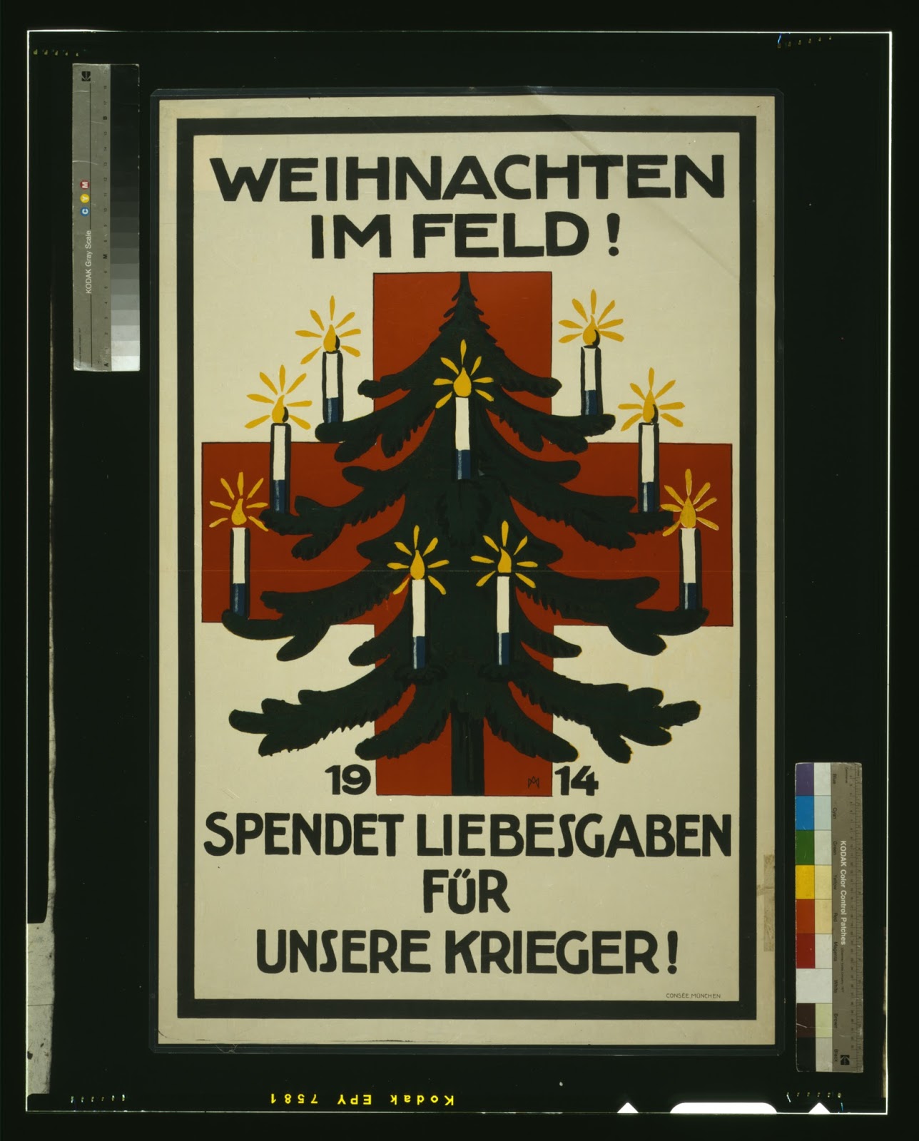 From the Library of Congress: Poster shows a Christmas tree decorated with candles in front of a red cross. Text: Christmas in the field! 1914. Donate gift packages for our warriors!When Europe went to war in the fall of 1914, many were sure that soldiers on both sides would be "home by Christmas." Then the first ugly battles took place, and that thinking changed. World War I would see not one but four Christmases, and many soldiers were still in France and Germany for the Christmas after Armistice Day in 1918.