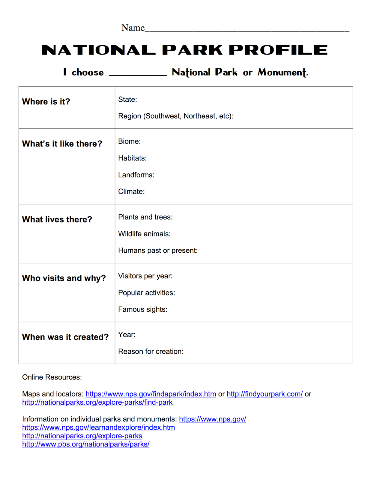 As part of the celebration, NPS is encouraging everyone to discover nearby national parks. It's called Find My Park and displays parks by state or zip code. Try it out! Not able to travel right now? Engage young people in the centennial with a virtual road trip to a national park or national monument. How? First, invite kids to choose a national park or national monument to profile using a road map or the online NPS map. Then have them research the park or monument to fill out this graphic organizer.