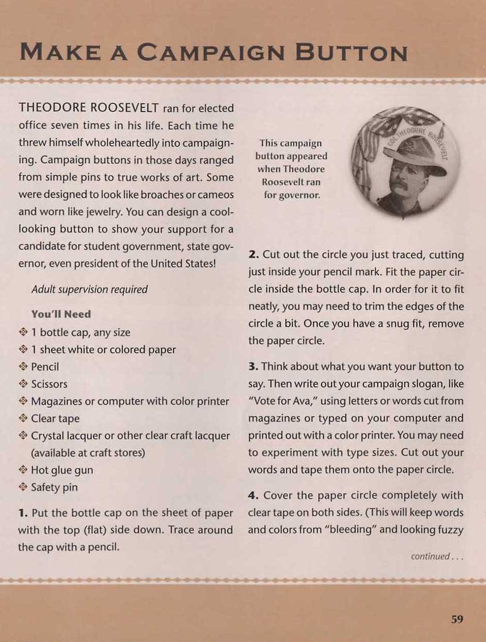 Activity: Presidential election materials, like buttons, are rare from the early 1800s. But you can make your own using Kerrie Hollihan's activity from her book, THEODORE ROOSEVELT FOR KIDS.
