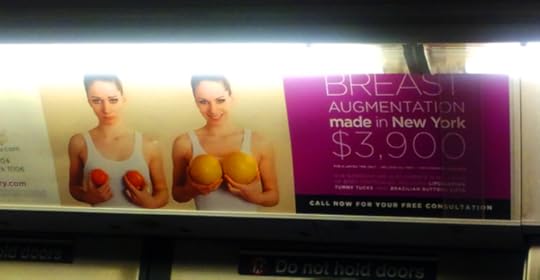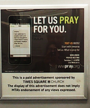 I recently saw both of these adverts on New York City subways. Leaving aside the question of whether it's appropriate for something like the plastic surgery advert to be prominently displayed where children routinely are present, should one assume the MTA endorses breast augmentation, or simply that it has a problem with Christians? It had never occurred to me before that the MTA was endorsing any product or service advertised on trains, buses, or stations.