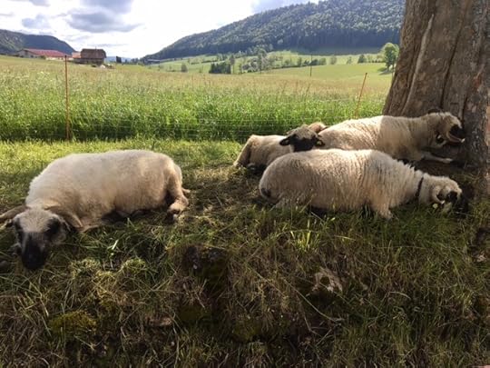 My favorite sheep have appeared by the roadside, where I walk daily as part of my work shift when weather permits … I think they are Valais Blacknose, also known as the world’s cutest sheep. When their fleece grows you can see why: it’s long and curly and makes them look adorable. Here they are taking a nap, and I can only aspire to be so relaxed.