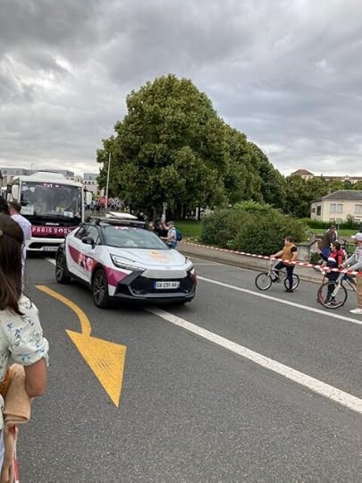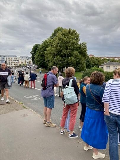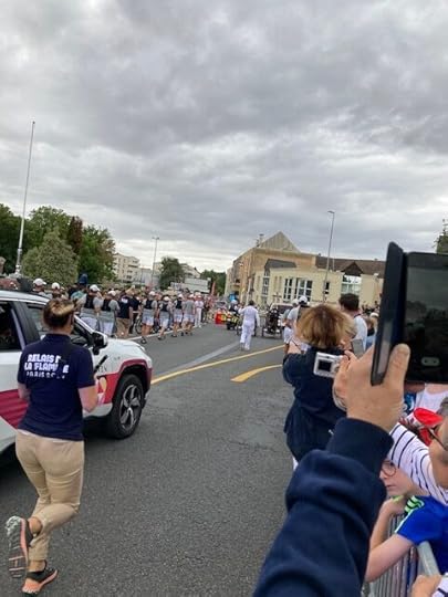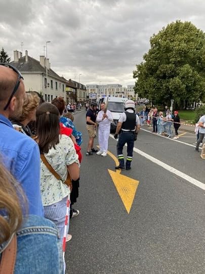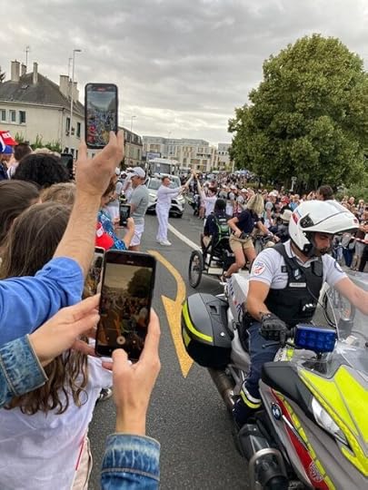 It’s quite a parade. First to approach were trucks selling Olympic merchandise, then several buses full of torch bearers — there are about 12 people listed for the Chartres stage alone, and I guess dozens of them must tag along for at least part of the whole journey.