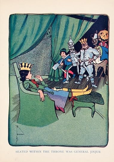The theme of sentient beings deserving autonomy and self-determination is another one that will develop through the series, though it’s not quite mature yet in this one. I was sometimes taken aback by how impatient and dismissive the other characters were of Jack, whose guileless remarks are derided as stupid, even by his “father,” Tip. He is often taunted with the fact that his head will spoil and his life will come to a rotten end, something that will change later in the series when Baum decides to confer immortality on Oz. In this book, though, morbid humor abounds, perhaps also intended for the stage.