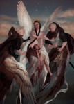 Russian artist Olya Bossak, AKA Reycat, makes surreal and moving illustrations of cryptids, creatures, and animorphic humanoids, such as her “alternate angels,” which put the downward-facing wings under the arms. The change is subtle but effective, turning them from vessels of divine light to demigods with their own personality and agency.