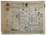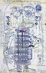 A similar but looser style can be found in the works of Jean Perdrizet, a Frenchman who “was a combat engineer in Grenoble, then at Électricité de France from 1944 to 1949. Around 1955 he started to invent prototypes and draw plans of machines to communicate with the ghosts or aliens : an ‘electric ouija,’ a ‘thermoelectronic net for the ghosts,’ a ‘Robot cosmonaut,’ ‘space scale,’ an ‘imagination cursor,’ a ‘flying pipe.’ He also invented a universal language, the so-called ‘T language.’ He sent his studies to NASA, CNRS and the Swedish Royal Academy of Sciences.”