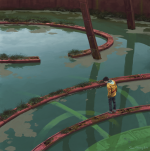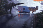 I imagine a pod of large herbivorous dinosaurs grazing on the weeds of an abandoned Wal-mart. Someone resurrected and released them (one of the events that led to the passing of the STCA), and they’ve just become part of the world.