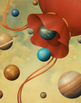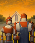 Artist Bill Mayer has created book covers and illustrated classic stories, including Orwell’s Animal Farm. His fine art blends the eerie and whimsical into dreamlike alternate realities where plants and animals make up aristocratic high society and yeoman robots plow the earth by hand.