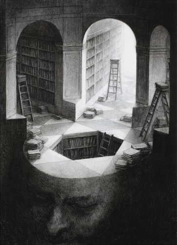 I stumbled across the mind libraries of Paul Rumsey on Twitter the other day and was immediately blown away by how evocatively simple they are. At first, my eye wanted a little more detail than a fuzzy medium like charcoal can provide, but upon reflection, I think the shadowy, blurred representation is perfect for the subject matter — a lossy memory, a misattributed quote, the conflation of a friend’s experience with our own.