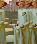 The middle girl is at the back, keeping to herself, as middle children do. (I am a middle child.) She is neither the most responsible nor the center of attention, yet she finds provocative ways of expressing herself. She is the troublemaker, dressed in passionate red, and she alone greets the viewer with her eyes, bringing us further into the scene, making us part of it in fact. And her hands make an interesting gesture.