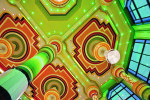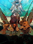 The artist uses an inspired patchwork of bright and distinct colors to blend his frenetic, meandering lines into a seamless whole. The result, while resembling a kind of impossible stained glass window or deranged paint-by-number, is nevertheless subtle, raw, and distinctive.