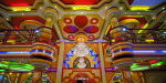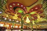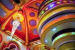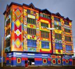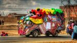 Each of his buildings has a futuristic façade, a commercial ground floor with jazzy shop fronts, a baroque party hall on the mezzanine, a story or two of apartments, and an owner’s penthouse. This aerie is sometimes called a cholet, a pun on the words “chalet” and “cholo”—a dismissive racial epithet [like the N-word] that cholos like Mamani have proudly embraced. Mamani’s architecture incorporates circular motifs from Aymara weaving and ceramics and the neon colors of Aymara dress, and it alludes to the staggered planes of Andean temples. But it has also been inspired by science fiction, particularly by the Transformer movies. [text adapted from The New Yorker]