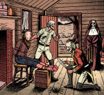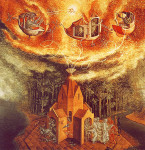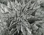 While seeking a solution to the brimstone problem, and for reasons unknown, the heavily reinforced furnace exploded. The damage was still visible in the upper corner, where the thick metal turned outward like shark’s teeth. That hole was now the primary ingress to the space. Of course, in the conflagration that followed the explosion, the true nature of Dunvluddich’s experiments was revealed and he was sanctioned by The Masters and told to stop at once upon punishment of dispossession—or worse. He didn’t, of course. He moved instead to Chicago, where the hellion ultimately escaped, triggering the Great Fire of 1871. Abraham Dunvluddich was tried and convicted by a tribunal magique and imprisoned. By the time I met him, he’d been locked in a cell so long that he was both quite aged and quite mad. He never stopped designing, however. The walls of our cell were covered in arcane engineering diagrams, one on top of the other.