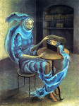 In 1963, at the age of 54, Varo died of a heart attack in Mexico City, prompting the surrealist poet Andre Breton, one of the founders of the movement, to comment that she was “the sorceress who left too soon.” (adapted from Wikipedia)