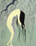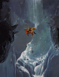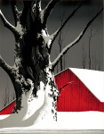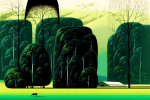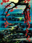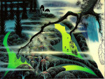 Like his earlier contemporary, Normal Rockwell, Eyvind Earle made beautiful “everyday art,” art meant to be looked at and enjoyed in the home — on the wall, on greeting cards, on magazine covers. Pay particular attention to his use of perspective, light, and shadow, in other words his use of angle and line. Also note the high influence of Eastern screen painting and woodcuts on his pastorals: the way a single branch drapes down in front of a view of an exaggeratedly broad forest or steep mountain face.
