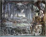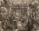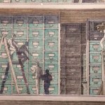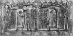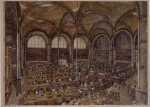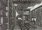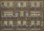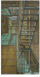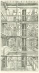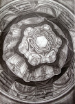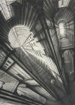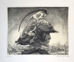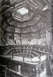 A more conventional example of his skill with architectural space is a recent (2001) depiction of the main reading room of the Bibliothèque Nationale in Paris, La Salle Labrouste. More than three feet wide and done from a high perspective, the print captures the vast dimensions of the room with its arched walls and multidomed ceiling vis-à-vis the tiny figures of knowledge-seekers deployed at acres of tables.”
