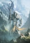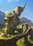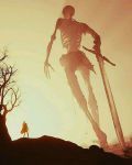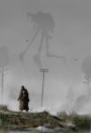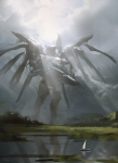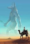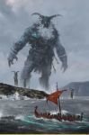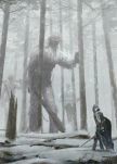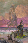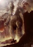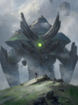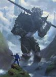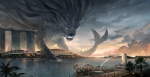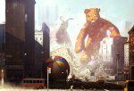 Even more important than their change in relative size, however, is how the people in these images are no longer active. They are typically standing in silence or otherwise going about their day. Occasionally, a weapon is drawn, but it seems fundamentally defensive. And also somewhat useless. There is no sense, as with the Elmore painting, that we could do the god any harm. Nor is it clear the god, dragon, monster, or robot has any interest in the puny mortals before it.
