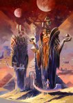 Jian Guo, known as “Breathing,” is a Chinese-Australian artist and illustrator whose colorful works seem almost like stills taken of bright swirling contraptions — stained-glass orrerries that turn and twirl and clatter like old mechanisms. It’s not surprising then that he’s done a number of Chinese-edition book covers of classic “cosmic fantasies” like Lord of the Rings and Gene Wolfe’s Book of The New Sun. Click an image below to enlarge.