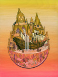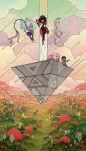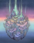 It’s hard to be unhappy looking at the work of Nicole Gustafsson, AKA Nimasprout. Relentlessly bright and colorful, her art is both cosmic and hermetic. Whether it’s islands in space dripping rainbow rivers or pop culture franchises sealed under glass (Goonies, Beetlejuice, Stephen Universe, etc.), her spaces are unbounded and yet contained, just like fictional worlds she depicts.