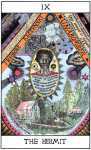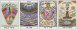 Next we have selections from a tarot deck by author Suzanne Treister created to accompany her book HEXEN 2.0, a sequel to HEXEN 2039, wherein she laid out a vision of the future based on the “interconnected histories of the computer and the Internet, cybernetics and the counterculture, science-fiction and scientific projections of the future, government and military research programmes, social engineering and ideas of the control society; alongside diverse philosophical, literary and political responses to the advance of technology including the claims of anarchoprimitivism, technogaianism, and transhumanism” (Amazon). The deck features, among other things, Timothy Leary as The Magician, Robert Oppenheimer as the Six of Pentacles, and Ada Lovelace as the Queen of Cups.
