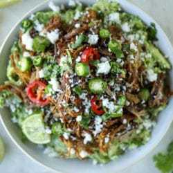 Place the avocados, the cheese, cilantro, onion, lime juice, salt and pepper to a bowl and mash it! Mash and stir until everything is combined. Make it as smooth or as chunky as you’d like! Taste and season with additional salt, pepper or lime juice if needed. Top with the pork, a sprinkle of extra cheese and cilantro and a few sliced peppers!