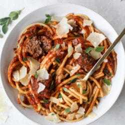 While the meatballs are simmering, bring a pot of salted water to a boil and cook the bucatini according to the directions. Serve with meatballs and sauce – and parmesan cheese and fresh herbs!