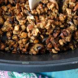 But back to our stuffing. While this isn’t IN the bird, it stays super moist (no, there is no other word to use unless you’re okay with “wet stuffing”) and flavorful in the slow cooker AND the rounded edges get a bit of that crisp!