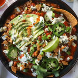 When it comes time to serve, serve in bowls with toppings of extra wing sauce, grated cheddar cheese, crumbled blue cheese, green onions, chives, avocado and lime wedges!