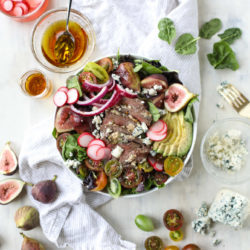 Once the steak is finished, assemble the salad with the greens in a bowl. Tp with the figs, avocado, tomatoes, pickled onion and radish and extra gorgonzola. Top with the steak and serve with the vinaigrette!
