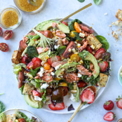 You know that I’m ALWAYS on the search for a non-boring salad. Enter… strawberry salmon panzanella salad!