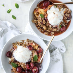 Bake for 35 to 45 minutes, until the fruit is caramely and the crumble on top is golden. Let it cool slightly before serving with ice cream. Garnish with fresh mint!