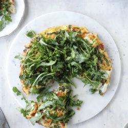 Toss the arugula with the olive oil, lemon juice and a pinch of salt and pepper. Pile it on top of the frittata before slicing and serving!