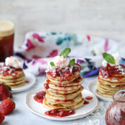 The post Mini Coconut Ricotta Pancakes with Strawberry Syrup. appeared first on How Sweet It Is.