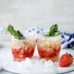 Place the strawberries in a bowl and toss them with the sugar, fresh mint and fresh ginger. Let sit at room temperature for 10 minutes. Add the bourbon and smash the strawberries with a fork or potato masher. Let sit for another 10 minutes before using. These strawberries can be used for 4 to 6 drinks. Keep them sealed in the fridge for a few days!