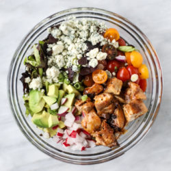 Assemble the salad by combining the lettuce with a pinch of salt and pepper, tomatoes, radishes, onion, blue cheese, green onions and chicken. Drizzle with the dressing, toss and serve!